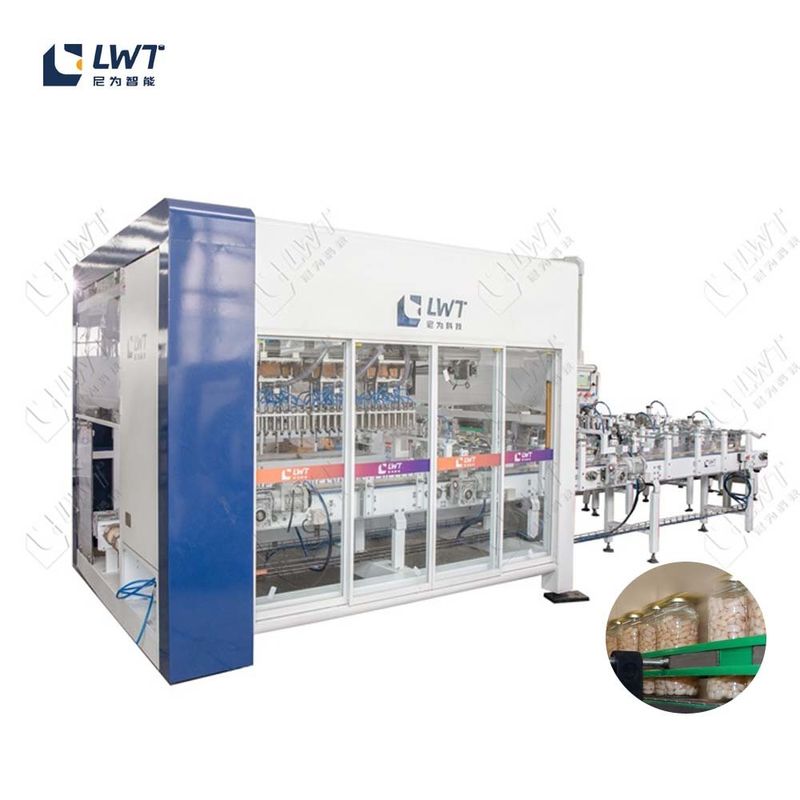 Esta máquina é adequada para frascos de vidro, latas de ferro, frascos de plástico, garrafas de boca grande e assim por diante.,Brise em molho de soja carne, frango, peixe e assim por diante, qualquer tipo de produtos sólidos enlatados medida e preenchimento.